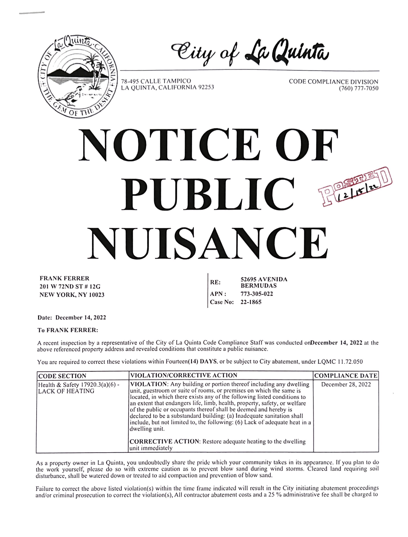 2022 Notice of Public Nuisance – 52695 Avenida Bermudas, La Quinta, CA 92253